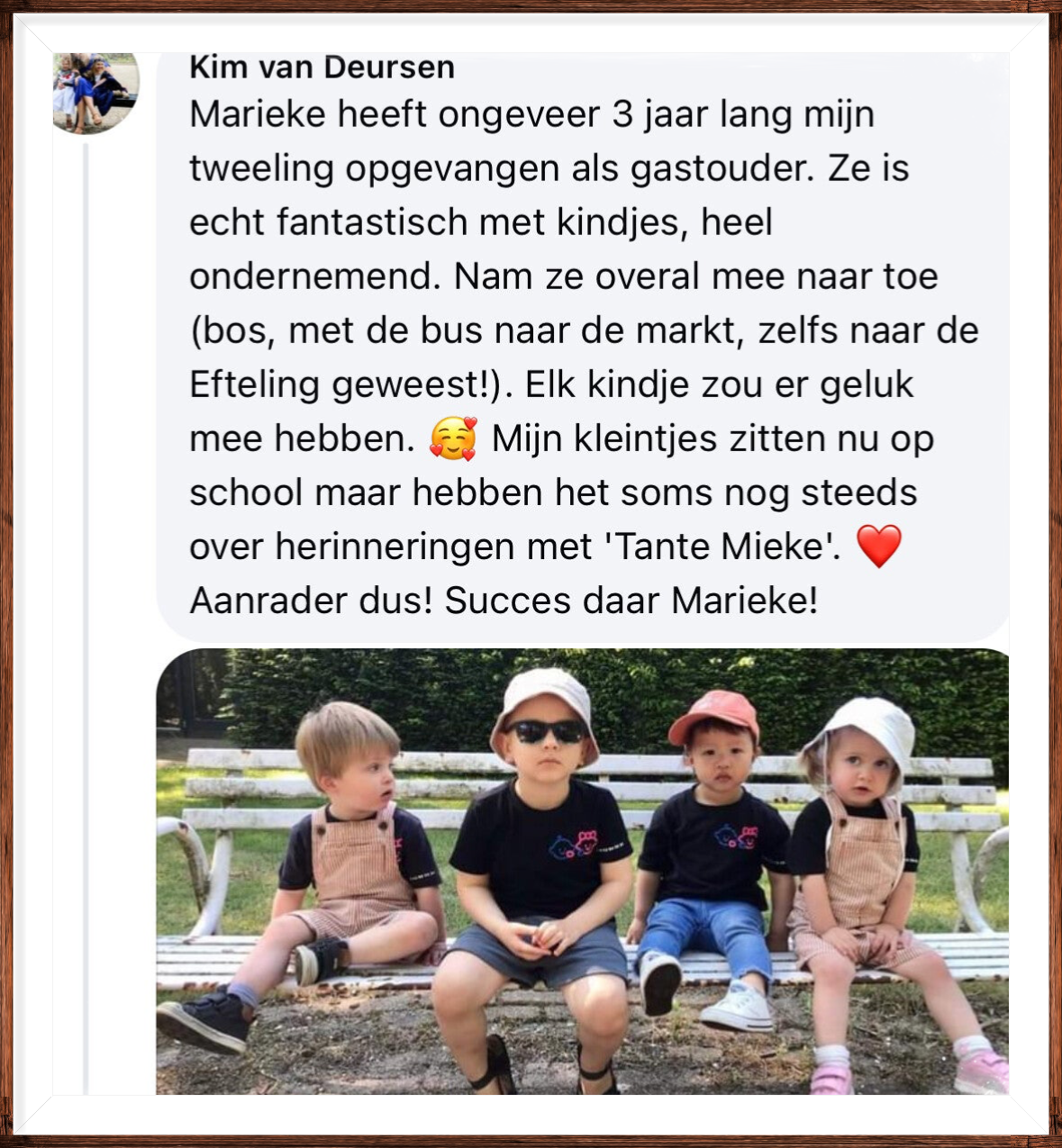 Onze zoon heeft het vanaf de start super goed naar zijn zin bij Tante Mieke. Marieke is een erg betrokken en enthousiaste gastouder. Ze onderneemt graag activiteiten met de kinderen zowel buitenshuis (bezoekje aan de speeltuin, naar een activiteit in de buurt, etc) als binnenshuis (knutselen, spelletjes). Marieke is lief en zorgzaam voor de kinderen en sluit goed aan bij de leeftijd en het ontwikkelingsniveau van de kinderen. Ook als ouder voelen wij ons altijd ontzettend welkom en waarderen wij de betrokkenheid, eerlijkheid en spontaniteit van Marieke enorm.
